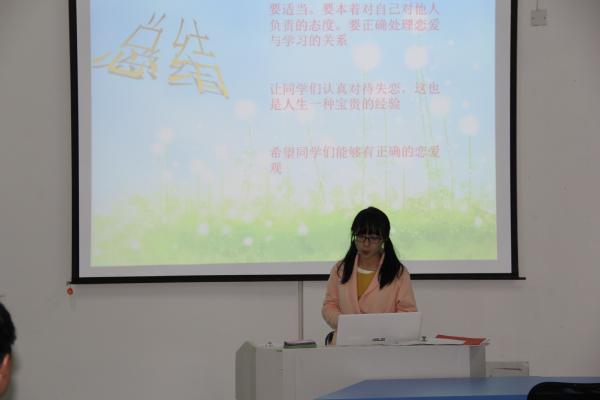 图为:参赛选手解说PPT中 参赛的各班心理委员依次上台结合ppt展示自己所设定的心理主题与具体方案。虽说都是围绕心理,可是各班主题各有不同,但大家都以创建健康班级为中心,提出了心理健康的重要性。据悉,预赛的第一名是建装3151班级,心理委员毛玲玲以“我们的大学恋爱”为主题的班会,展示了自己的班会设计,十分积极向上,最后取得了92分的高分,进入了决赛。建工3151班级以“微笑的力量”为主题的心理班会说课与建管3152 班级以“致青春”为主题的心理班会说课分别以85分与82分取得了第二和第三的好成绩,也纷纷进入了决赛。