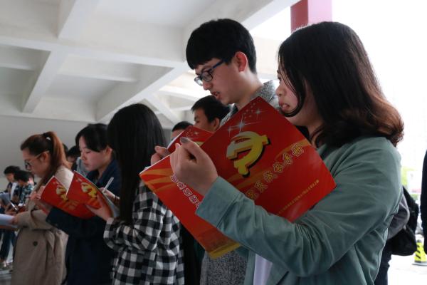 展览首日就吸引了海天学院学生党支部第二期入党积极分子党课培训班77位学员参与了学习。同学们热情颇高,人手一本党员成长手册,认真记录着学习要点,态度诚恳,学员之间相互探讨,进一步理解、把握《准则》和《条例》的基本要义和具体内容。这一学习形式激发了学员们的学习兴趣,学员们认真学习和研读的精神成为了食堂门口一道亮丽的风景线。