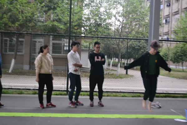 第一轮比赛是指压板,小组成员各司其职,先掂着乒乓球从指压板走过,与对面队友交接,交接完成球入箩筐下一位成员完成在指压板上跳绳的任务,最后两位男生完成背人投篮,这是考验队员的团结与默契的一项游戏。组员们在默契配合间,难分胜负,最后两组被淘汰,剩下六组进入第二轮比赛。