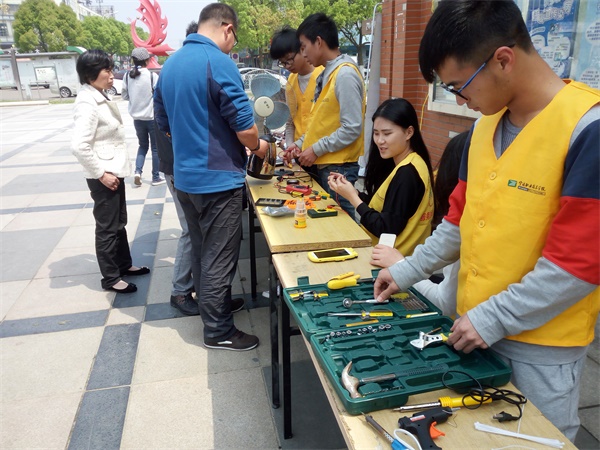 为了让同学们的技能知识应用于生活中,2016年4月17日8点30分在凤凰社区开展了家电维修的志愿者活动。本次活动由志愿者部部长王旭波带队,七名志愿者随队。