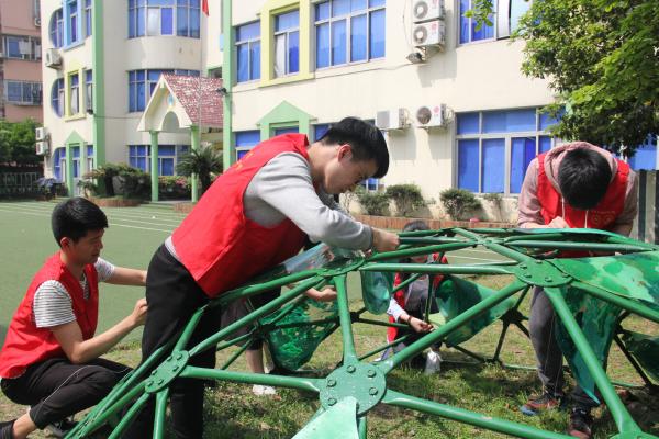 图为:志愿者为器材上色中