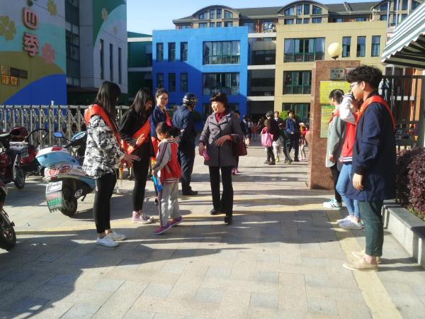 随着放学铃声的响起,在门口等候多时的家长们一窝蜂地涌进校园。志愿者们熟练地戴上了红绶带,在校门口两边整齐地排成两排等待着孩子们放学。在志愿者们的细心维持之下,家长们有秩序的带领着自己的孩子刷卡离校。当日阳光有些猛烈,但也丝毫减免不了志愿者们的热情。志愿者们亲切地向每一位小朋友挥手说再见,小朋友也高兴地向着这些可爱的哥哥姐姐们道别。