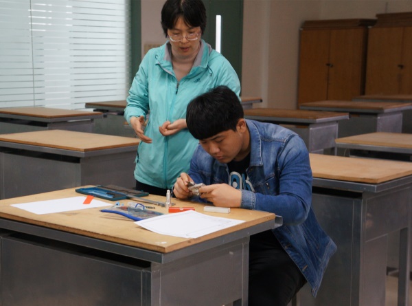 讲解结束后,冯老师让他们各自挑选两个零件开始测绘,同学们有条不紊的挑选着零件和测量工具。回到座位后,教室内没有任何杂吵声,只有零件与量具之间轻微的摩擦声。冯老师在一旁细心观察每一位同学的测量方式,对于不熟练或是有问题的测量方式,她都会上去耐心指导。