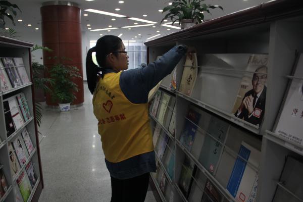 图为:志愿者在整理书籍 志愿者在图书管理员的带领下,很快的熟悉了工作内容。据悉,志愿者们进行的主要工作是图书的整理与摆放。在一排排的书架之间,你会看到志愿者忙碌而细心的身影,手上拿着书,不时地蹲下起立、拿书放书,我院志愿者的勤勤恳恳,为我们的图书馆打造了一个安静舒适的环境。在获得这样一个好环境的同时,志愿者们也同样懂得了图书管理员的辛苦与付出。不知不觉,时间悄悄溜走,活动就要结束了,志愿者给读者们提供了一个好拿好放的方便的阅读环境。