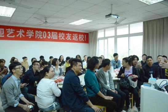 2016年4月23日下午9时,03届校友交流会在艺术学院205举行,艺术学院执行院长胡成明、艺术学院视传与艺术设计专业教研室主任胡成武以及办公室主任马磊老师出席本次交流会,并向校友们传达了学院领导对他们的热烈欢迎。在此艺术学院的签到墙越来越多的看到学长学姐们的签名,他们热情的问候作为16届的学弟学妹的我们,给我们讲述了一些专业知识,并分享于我们关于他们在校时的留影,学长学姐们的讲述让我们受益匪浅。