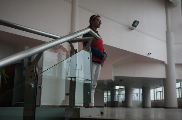 图为:志愿者在楼梯口负责引导