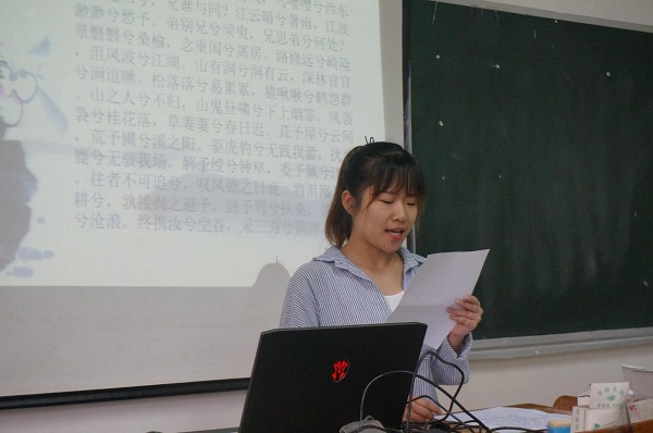 在主持人宣布比赛开始后,前10名选手到讲台前朗读规定的古文文章《守俭弟归曰仁歌楚声为别,予亦和之》,之后的选手在给出的《前赤壁赋》、《项脊轩志》、《报任安书》等文章中选择自己要朗读的文章。每一位选手都充分展现了声音的魅力,表现了汉语的美丽,其中商英3142张婷婷、商日3151朱梦佳等同学声音铿锵有力、绘声绘色,情感饱满充盈,赢得在场其他参赛者和评委的一致好评。