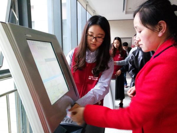 在自助挂号区,志愿者为就诊人员挂好号;在输液厅中,志愿者仔细关注每一位病人的输液情况;门诊二楼,两位志愿者站在楼梯口,细心地为就诊者指路;取检验报告单处,志愿者耐心地为他们取单提供帮助。