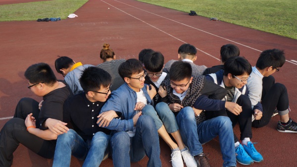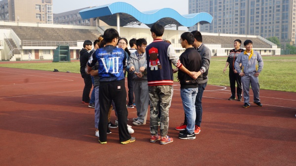 图为:晨练活动现场 首先进行绕操场两圈的热身运动,随后将8个小组分成了四小组,两两一组进行背靠起身游戏,经过激烈竞争和比拼,一、二小组为最后的失败组,并接受了两个惩罚——跳小学生的广播体操和两人一队跳钢管舞,虽然很羞涩,但是同学们还是认真完成了惩罚项目,最后一个小组对此次晨练做了总结,晨练圆满完成。
