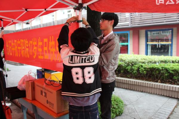 图为干事们正在拉横幅