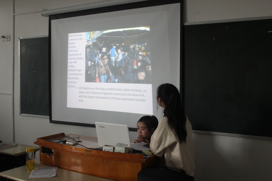 本节课的主题是“生活在美国的中国人”,由王越同学和吴茜茜同学进行讲解。用精心准备的PPT,熟练运用常用的重点词汇,两位同学的讲解让台下的同学听得津津有味。更精彩的是,两位同学通过一段中美留学生学习生活的视频生动有趣地表现出了中美的文化差异,引得课堂上笑声连连。在之后的游戏环节中,同学们不仅巩固了语言点的知识,还得到了学习之余的乐趣。课程结束之后,杰西老师给予两位同学高度的评价,并作出总结。