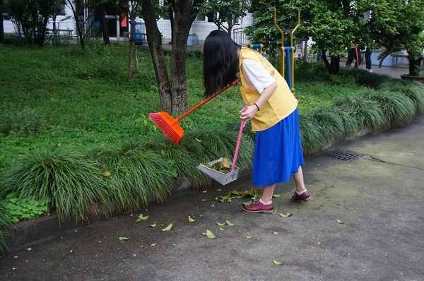 图为:志愿者在清理室外的落叶