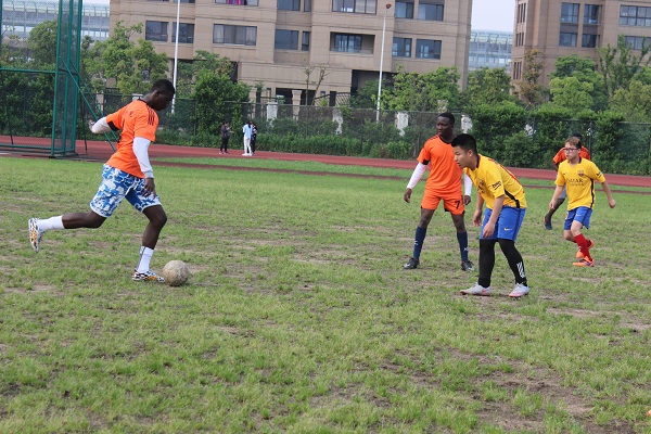 裁判将球掷于开球处后,一声哨响下,国际选手率先抢球,以熟练的脚法,侧身躲闪,大腿颠球,头部颠球等一系列进攻,但因建工学院后卫严防死守,两队在第一上半部分均无进展,而之后,建工选手犯规被罚点球,我院后卫因防守失误令对方进球得分,因此,上半场比分为1:0,建工学院暂时领先。中场休息后,国际学院选手在整顿休息后,重振旗鼓,我院5号选手Armand顽强拼搏将球冲破防线进球,球擦门柱进球门死角,扳平比分!在此之后,国际选手们越战越勇,发起猛攻再次进球,在比赛结束前几分钟,我院11号选手Yves一脚抽射,将球打入球门死角得分。最终,我院以3:1的成绩成功获胜。