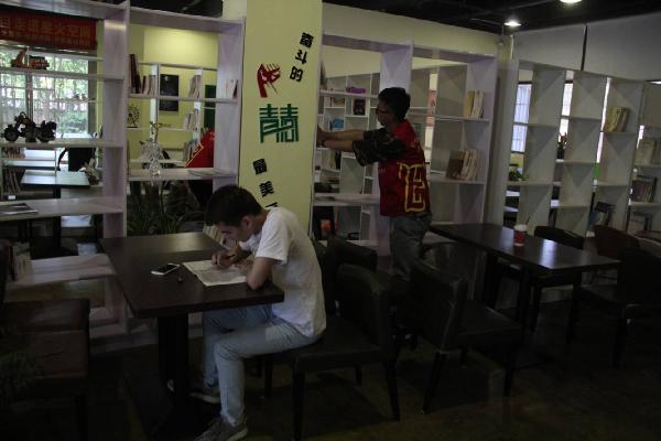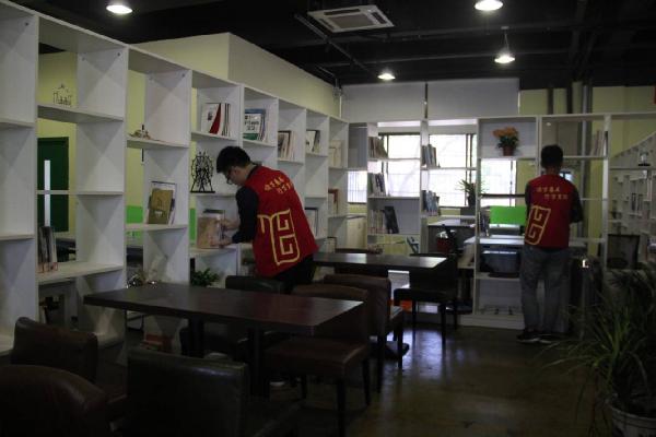 为了让同学们能够以积极的心态参加志愿者,电信学院于2016年5月12日中午进行图书馆志愿者活动。电信学院志愿者部组织了志愿者活动,本次活动由志愿者部干事钱凯轮带队。图为:志愿者整理书籍中 下午1点30分志愿者们在图书馆集合,在黄老师的带领下,志愿者们先去了众创空间整理图书馆借的书,在志愿者们不懈的努力下,很快就把书整理完了,然后志愿者们去了星火燎原咖啡吧整理书籍。咖啡吧里的书籍总共有2000本,书籍种类繁多,对志愿者们造成了不少得困扰,一本书有时候要绕好几圈才能摆放正确,尽管这样志愿者们仍细心的做好一切,站起,蹲下,又站起,行走,又蹲下,这样幸苦了几小时候终于完成任务了。图为:志愿者整理书籍中