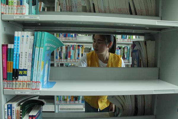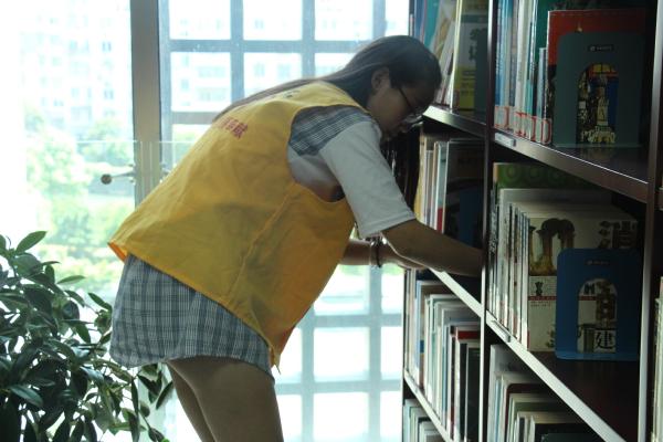 图为:志愿者认真整理书架