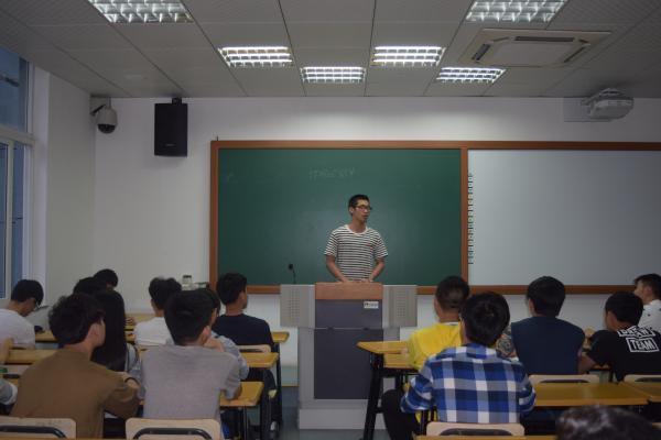5月24日晚6点,电信学院团委学生会在精技楼405教室举行了第七届实习团学助理第一次会议,本次会议由学生会主席谢柏通同学主持。全体团学干部以及51位实习助理参加了会议。图为:学生会主席谢柏通演讲
