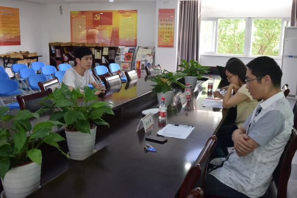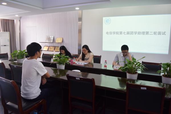 为打造更优秀的团队, 2016年5月25日下午三点电信学院于敬业楼党员之家进行团学助理第二次面试。电信学院团委书记陈宇老师,电信学院学工办主任刘利峰老师,电信学院辅导员陈洁琼老师担任本次面试官。图为:面试中