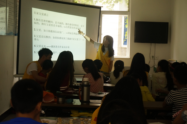 图为:志愿者给孩子们讲解父亲节的知识