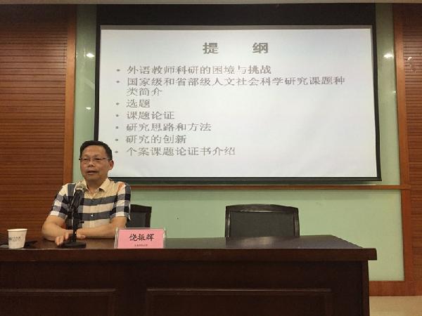 为提升国际学院外语教师的科研能力,切实加强外语教师课题申报的成功率,2016年6月22日,国际学院邀请到了江西师范大学饶振辉教授、博士生导师为我们做了一场“潜心研究用心申报---‘漫谈外语类课题申报的方法与技巧’”的精彩学术讲座。