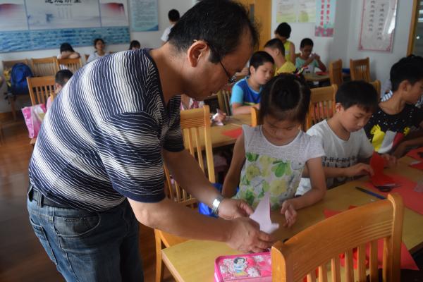 图:朱老师帮助小朋友剪纸