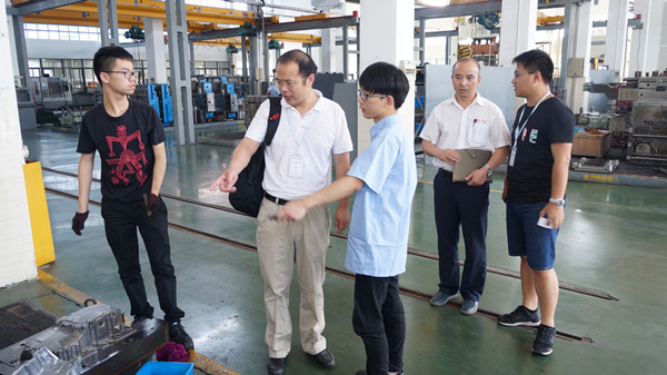 双方就进一步有效搭建区校合作的平台展开了洽谈。在校地合作、区校共建的大背景下,海天学院在实现党团共建的前提下,根据校地合作的发展方向,结合专业特色和企业用工实际,通过联合地方政府、街道社区,利用暑期时间充分深入企业开展实地调研,协力推广“现代学徒制”合作机制,最终实现“校、地、企”三方联动模式下大学生职业能力的提升。灵峰社区作为大碶高档模具及汽配产业园区,对海天学院思政管理融入专业教学的理念表示认同和支持,并致力于通过已有平台进行推广和普及。调研组在社区第一书记王学蕾的陪同下走访了宁波埃利特模具制造有限公司和宁波盛技机械有限公司,实地考察了“现代学徒制”的开展情况。