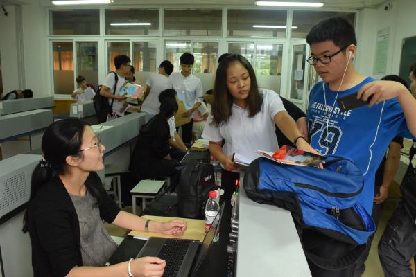 图:班主任和班助一起完成新生报到工作