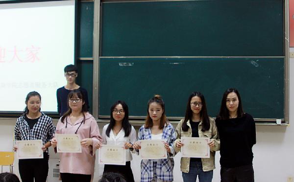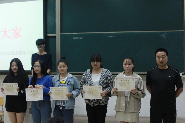 魏雷老师先简单的介绍了我分院志愿者服务大队负责的各项日常志愿服务:导医、新蕾、阳光、报刊亭、图书馆等。随后,他向大家介绍了获得志愿者活动的积极分子的名单,有张晓晓、孙梅丽、张椿等人,这些同学积极参加志愿者服务及APP援外项目,获得了许多志愿者服务时间。因此我分院颁给以上同学个人志愿者服务突出贡献奖,魏雷老师和钱忆老师祝贺每位获取此等奖项的同学们并亲自给予他们颁奖。