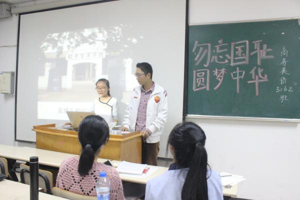 为培养学生的爱国意识,增强学生的奋斗精神,为学生塑造正确的人生观、价值观,国际学院于2016年10月23日晚七点在国际楼举行了以“勿忘国耻,圆梦中华”为主题的团日活动。据悉,应用韩语、应用德语、应用西语、商务英语以及商务日语等多个大一班级纷纷展开了自己的主题活动。