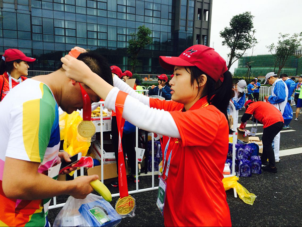 半程马拉松服务组的志愿者目的地主要在梅山。到达目的地时,空气潮湿,天气寒冷,但这并不影响志愿者们激动的心情。稍作休息后,志愿者们便开始热火朝天地工作——为运动员的到来,做好各项准备。随着半程马拉松的运动员们陆续到达终点,志愿者们也纷纷走上自己的岗位,为运动员们递上完赛包和香蕉、戴上奖牌等。当到达终点的运动员越来越多时,之前志愿者们准备好的完赛包也越来越少,甚至紧缺。但志愿者们并没有慌乱,而是有序迅速地装出新的完赛包。大家众志成城,一起努力,很快便装出了新的完赛包并及时地发放到运动员手中。每位志愿者脸上都带着灿烂的笑容,为运动员递上完赛包时都会对他们说:“辛苦了!你真棒!”。志愿者们将自己最好的面貌展现给运动员,尽自己最大的努力为他们服务。