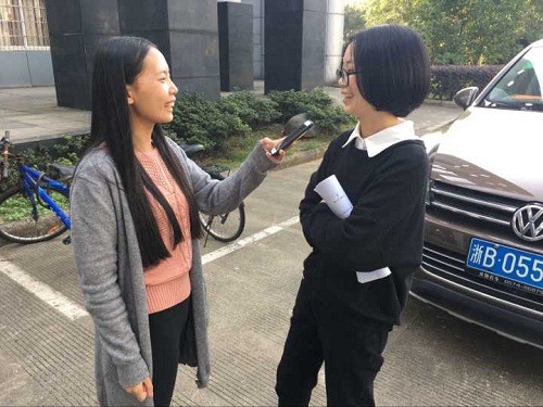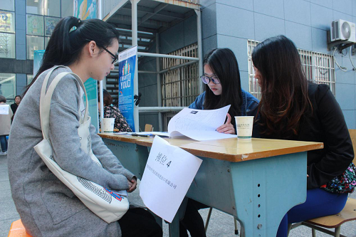 图为:新闻部干事对面试后的应届毕业生进行采访