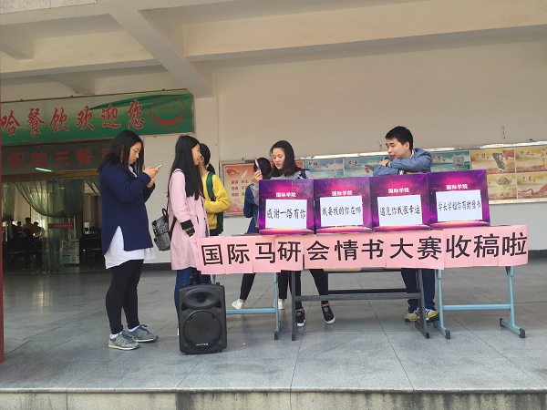 为丰富校园文化生活,活跃校园文学气氛,国际学院马研会在11月3日中午在食堂门口进行情书大赛的收稿。此次活动面向全体学生,分为四类:一为感恩信,二为单身情书,三为双人情书四为给前辈的信。因此,团委学生会的各位干事在食堂门口耐心等待同学们寄信。