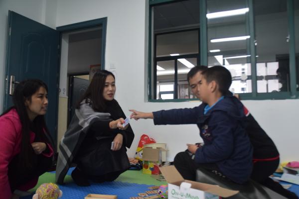 图为:钱忆老师用心地跟孩子沟通