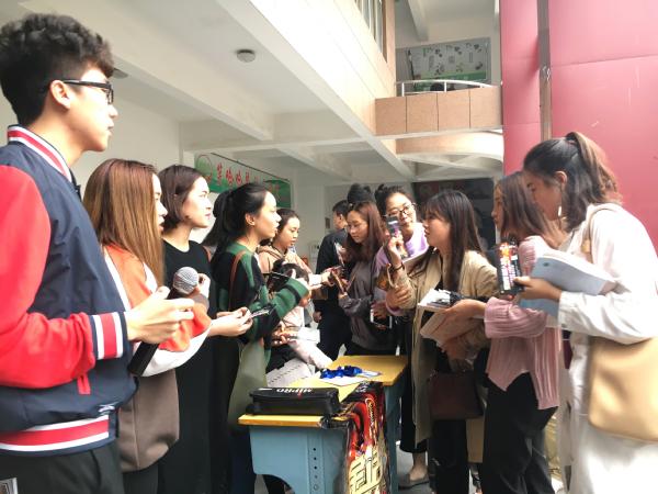 同学们都踊跃参与到抢票活动中,都希望能进入李惠利大剧院,亲临现场感受每个主持人的魅力。文娱部的部长助理及干事们站在食堂门口,拿着“金话筒”决赛的入场券,一张张将入场券发放到同学们手中。干事手握话筒,配合着动感的音乐,一声声“总院金话筒主持人大赛火热开赛”吸引了越来越多的同学前来围观。每一位干事都面带微笑,认真耐心的服务着每一位来拿票的同学,热情地将票交到同学们的手中,干事们一丝不苟、热情积极的工作态度,得到了大家的一致好评。