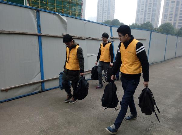 志愿者们在自己的岗位上早早就位,领路的学生高举手中的项目牌,为来自各地的考生指明方向。上午7点,考生们到检录处集合进行检录,检录完毕,由海天学院志愿者带领考生前往考场。天气寒冷,却丝毫不减海天志愿者们的热情,帮老师搬工具,帮考生拎书包,展现了海天学院志愿者的热情,发扬海天学院乐于助人的传统优秀品质。在这寒冷的冬天里,这样一群志愿者带给老师考生的是温暖,是海天学院的热情。技能高考持续了整整一天,志愿者们尽职尽责,对来往考生提供帮助。