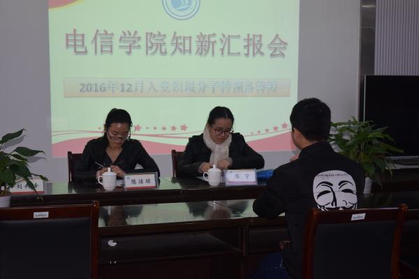 为了了解党积极分子的入党理由,提高党积极分子自身的思想素质,电信学院于2016年11月30日中午12点30分在敬业楼党员之家开展了入党积极分子转预备答辩活动,电信学院团委书记陈宇老师,辅导员陈洁琼老师出席本次活动。