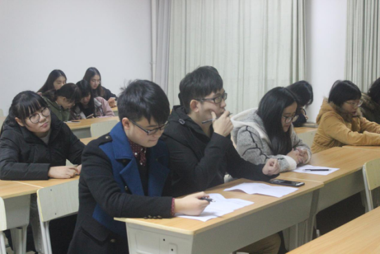 图为:国际学院马研会评委正听选手演讲