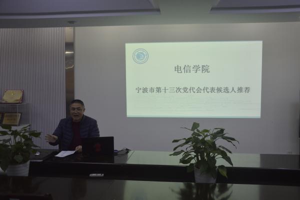 电信学院于2016年12月13日中午12点30分在敬业楼2楼党员之家召开宁波市第十三次党代会代表候选人推荐会议,本次会议由党总支书记龚友国主持,电信学院院长张岐,团委书记陈宇等30余名老师参加会议。