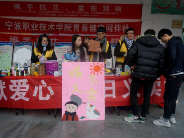 为在冬日里给环卫工人送去一份温暖,2016年12月14日中午11点30分,国际学院志愿者服务大队成员在学校食堂一楼展开了以“爱在校园,情系环卫工人”为主题的暖冬义卖。