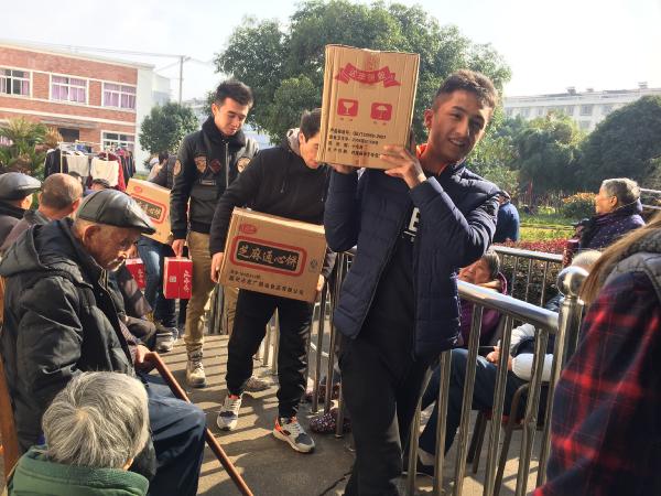 图为:少数民族城管义工队成员携带慰问品分发给老人们