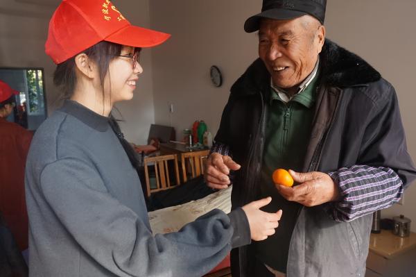 图为:志愿者为老人送去水果