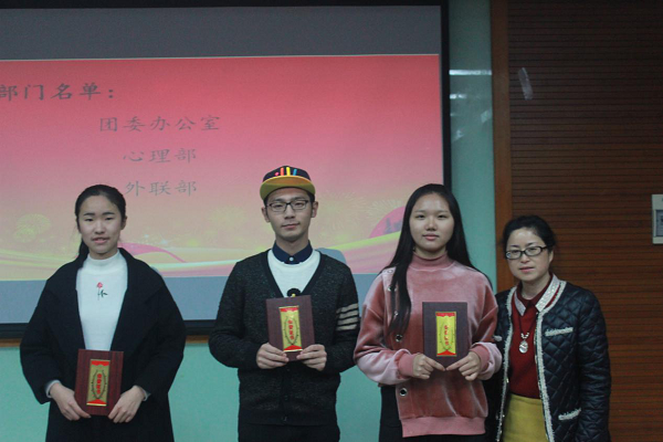 大会由主持人宣读开始,首先宣读表彰三个优秀部门:团委办公室、心理部、外联部。而后表彰优秀干事张霞等十七名,团校优秀学员彭灵等十名,优秀寝室17个,优秀志愿者蓝欣欣等5名,优秀义工苏彩薇等10名以及运动会期间为国际学院获得荣誉的29名运动选手。随后优秀部门代表外联部部长童昶发表讲话,他讲述了在过去这一学期中的收获与不易,并特别指出对团委学生会各部门支持的感谢,感谢新闻部和媒体部的配合。他也讲述了这学期外联部的多风多雨,在拉不到赞助的不眠与茫然,最终在部门各个成员的积极配合下获得的成就。最后由袁建萍老师做了大会总结,她肯定了国际学院学子的优秀,她说到,国际学院的生机来源于学子们的努力贡献,望在接下来的一年中与国际学子们共同展望,开启新的诗篇。