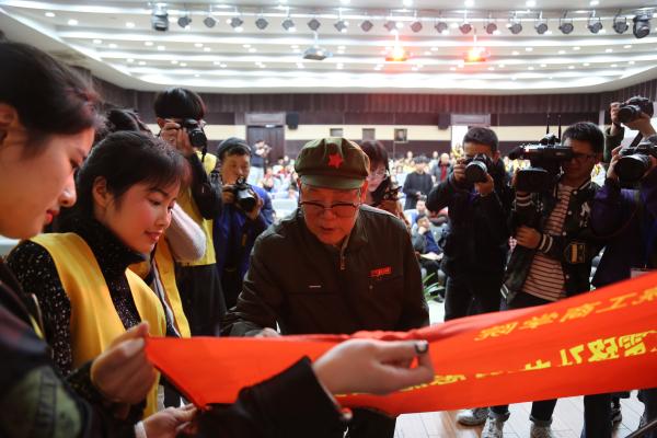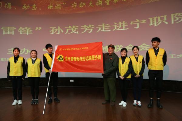 图为:孙茂芳为“宁职院工商学院当代活雷锋孙茂芳志愿者服务团”授旗并签名