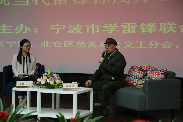 为纪念毛泽东同志题词“向雷锋同志学习”54周年,大力弘扬雷锋精神,2017年3月4日下午宁波职业技术学院西校区环幕报告厅,举办了一场由宁波市学雷锋联合会主办,北仑区慈善总会义工分会、宁波职业技术学院工商学院承办,北仑区阳光慈善义工大队协办的“雷锋视界”第三期交流访谈暨宁职大讲堂第四期活动。本次活动邀请到了“当代活雷锋”孙茂芳同志,出席本次活动的嘉宾有宁波市学雷锋联合会会长吴在明、宁波市北仑区慈善总会义工分会会长赵燕儿、宁波市人大代表兼新碶街道社会服务中心党支部书记陈军浩等社会优秀志愿者,以及宁波职业技术学院校长兼党委副书记张慧波教授、宁波职业技术学院党委副书记齐小萍老师、宁波职业技术学院党委副书记兼纪委书记邵坚钢老师以及宁波职业技术学院工商学院的院长及党总支书记等校内老师,宁波职业技术学院的党员积极分子与志愿者们也代表参加了此次活动。