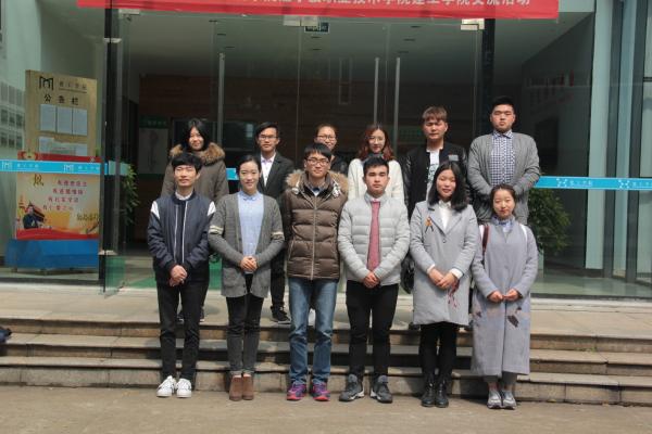 图为:城院学生会与我分院学生会交流中  图为:合影留念 本交流会由学生会构成概述,各部门分别介绍和经验交流三个部分组成。首先,我分院学生会主席滕靖娴同学结合我分院的发展历史,就我分院现有专业和我分院的特设活动两个方面做了简单介绍。接着,宁城院景观生态学院学生会主席施嘉锜同学也对我分院积极促成本次交流会表示感谢,他表示并希望通过此次交流,两院能相互学习,加深了解,共同提高学生工作的服务水平。随后,双方就学院的发展与建设,学生工作中的具体问题进行了交流。双方学生干部也就学生日常管理、部门建设、活动创意等工作交换了彼此的经验,并对学生工作中一些重点和难点问题进行了深入探讨,交流会气氛热烈。
