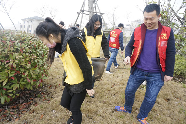 图为:志愿者与北仑志愿者社会服务人员捡垃圾