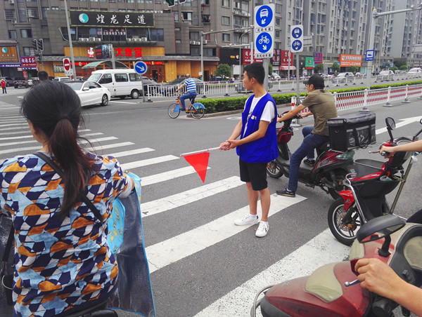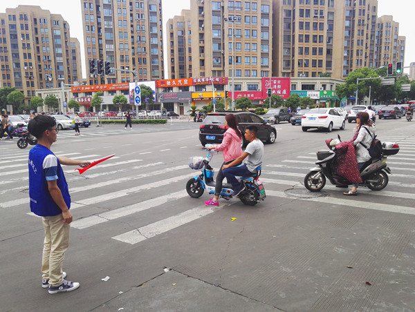 4月19日下午4点30分,参加活动的青年义工们在校园门口集合统一出发,熟练的来到新大路与庐山东路的十字路口,开展协助交通的义工活动。