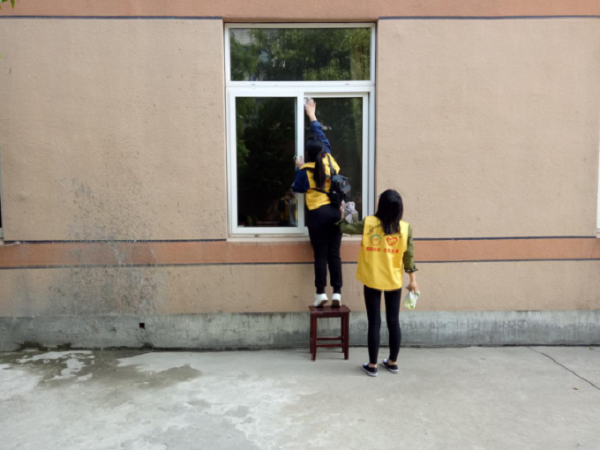 刚进入托老院映入志愿者们眼帘的是老人们正在悠闲地晒着太阳。志愿者们首先接过了扫把与抹布开始了清扫。春风吹落了黄叶,志愿者们用扫帚扫去;雨渍弄脏了窗户,志愿者们用抹布擦净。