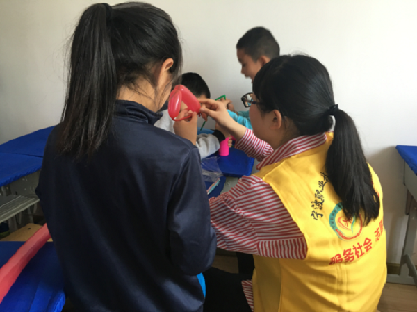 图为:志愿者教小朋友们编气球