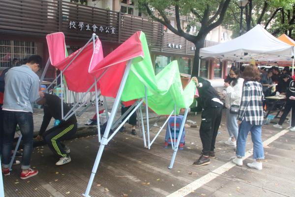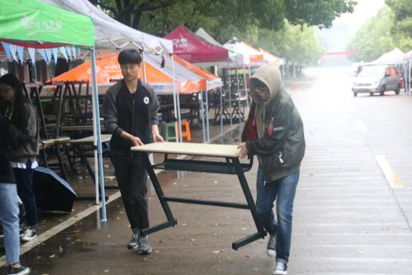 今天虽然是个下雨天,也丝毫没有影响干事们的热情。在庆典开始后,干事们卖力吆喝,用自己最大的热情来欢迎每一位顾客,向每一位路过的人极力推荐。随着一天的努力,工商学院准备的物资基本售空。在人潮散去后,他们认真清扫地面,清理遗留下来的垃圾,收拾干净整洁后才离开。