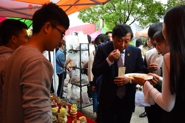 图为:宁波职业技术学院校长张慧波品尝糕点